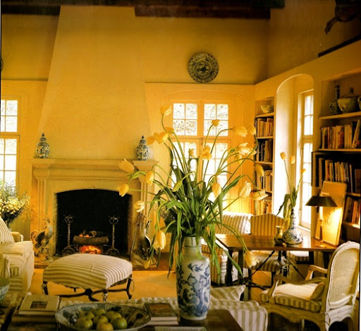 Years ago, about 16 years I suppose, I saw the above picture in a magazine - I don't remember which magazine it was, but it was probably Southern Accents. I fell completely in love with this room. I adored everything about it - the then, in vogue taupe and white striped linen fabric on all the furniture, the creamy stucco walls, the french furniture, the fireplace, the blue and white porcelains, the books, even the platter balanced above the molding. Years later I learned it was designed by Dan Carithers from Atlanta, someone whose taste I have come to admire greatly. It's fitting that my favorite room was designed by Carithers. Over the years whenever I've had a client present a picture from a magazine of a look they like, it's always a room by Carithers, always. I digress.