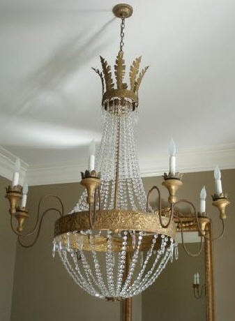 There was still one thing missing from the room that I had planned to buy, if I could ever find it. One day last year, I was at Tara's (of course) when I spied a crystal chandelier - antique, but not period. It was a French Empire light fixture. There had been one just like it before that was "mine." At least, I thought it was mine, I was promised it was mine, but that other fixture got sold out from under me by mistake. And there was yet another one after that that was sold before I could buy it. I didn't want to lose another chandelier that I loved again, so I bought the one at Tara's after thinking on it for a few days. The great people at Alcon fixed it up for me - wired it, cleaned it, put it all back together, replaced missing crystals, and gave it new sleeves. And yesterday, it came home: